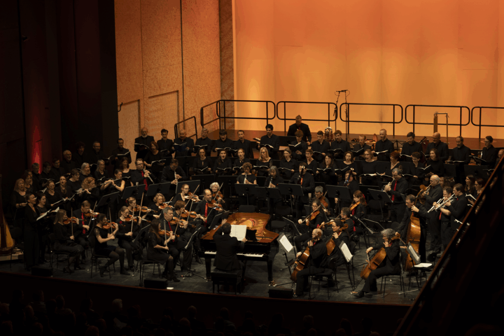 VIELFALT. Das ungewöhnlich vielseitige Repertoire beinhaltet die ganze Bandbreite der Chormusik und darüber hinaus. Das Fundament bildet die reiche Chortradition mit a cappella Werken und Oratorien des Barock (Bach „Jesu, meine Freude“, Händel „Messiah“), den großen chorsinfonischen Werken der Musikgeschichte (Beethoven 9. Sinfonie, Mendelssohn „Lobgesang“, Bruckner „Te Deum“), ausdrucksstarken Chorliedern der Romantik (Mendelssohn, Brahms), Volksliedern aus vielen Ländern sowie die Musik des 20./21. Jahrhunderts (Orff, Rutter, Whitacre, Gjeilo). Hinzu kommen gleichberechtigt Arrangements der Pop- und Rockmusik, des Swing und der Filmmusik. In den letzten Jahren wurde mit Uraufführungen „Philosophischer Vokalkunst“ (Wann haben wir genug? / Fragen im Spiegel / SEIN u.a.) ein weiterer Baustein im Erleben und Wirken von Musik hinzugefügt und damit neue Wege für die Zukunft der Chormusik eröffnet. Die Suche nach dem vielfältigen Ausdrucksgehalt der Musik ist ein prägender Antrieb.
